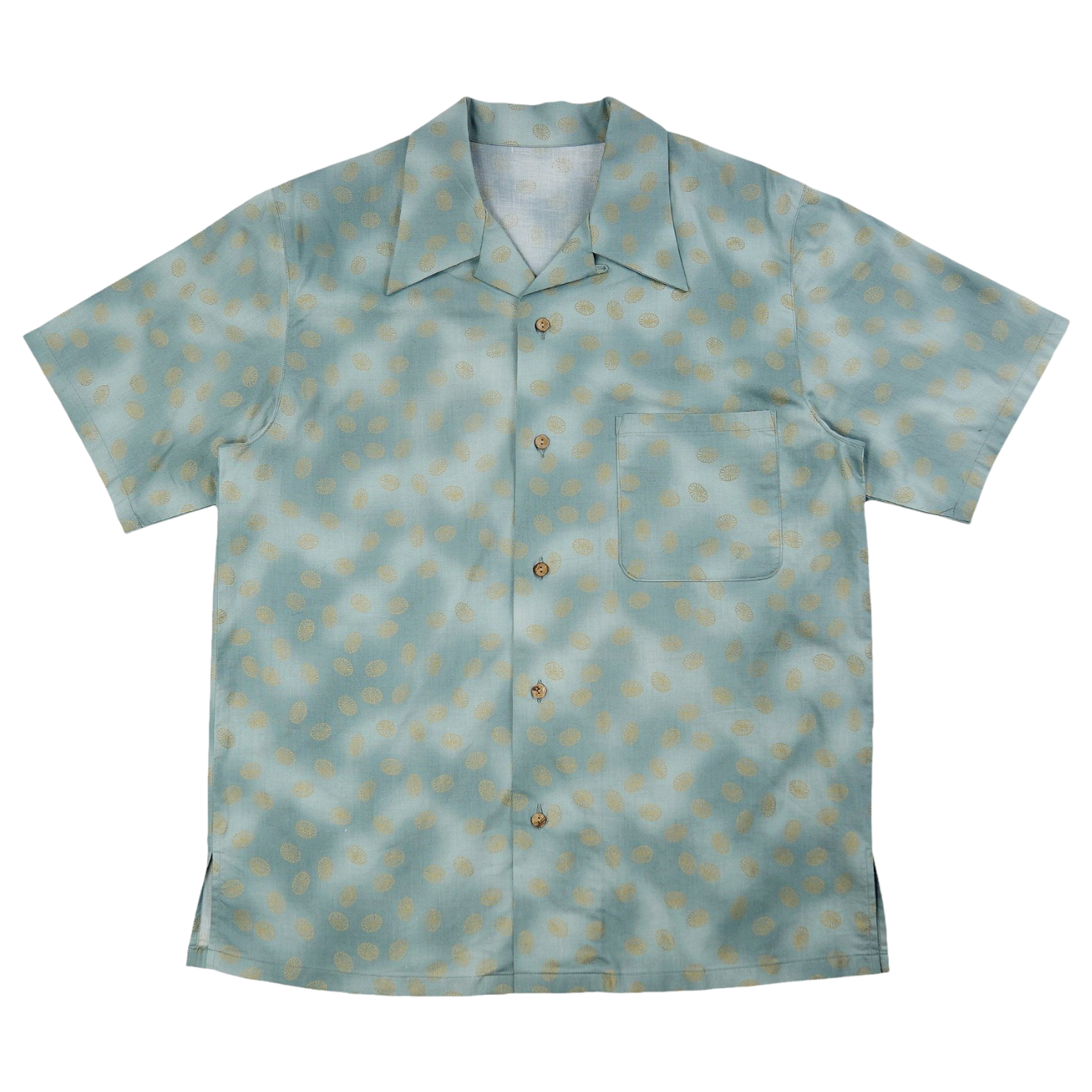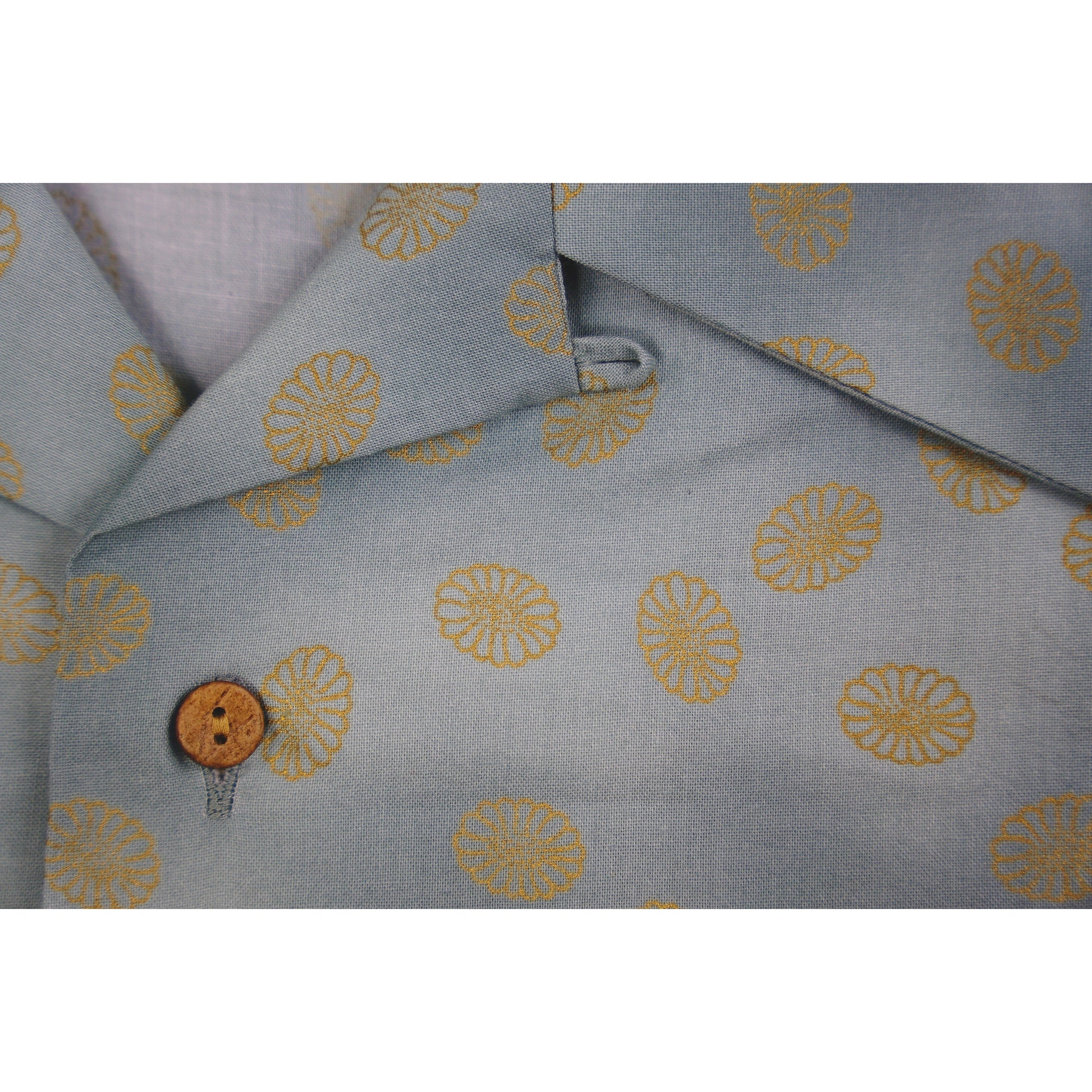 楕円の花柄の生地を使い、大きすぎないサイズ感のアロハシャツに仕上げました。